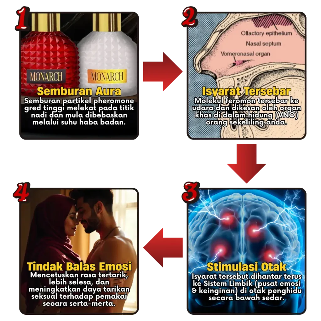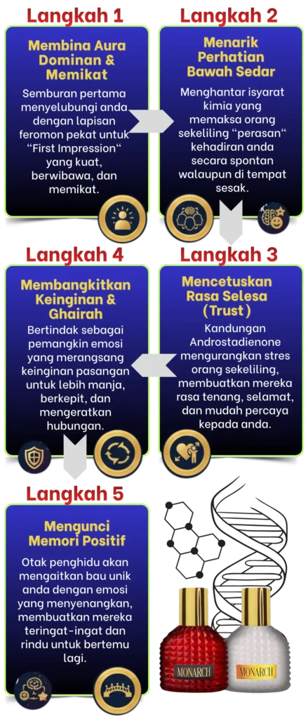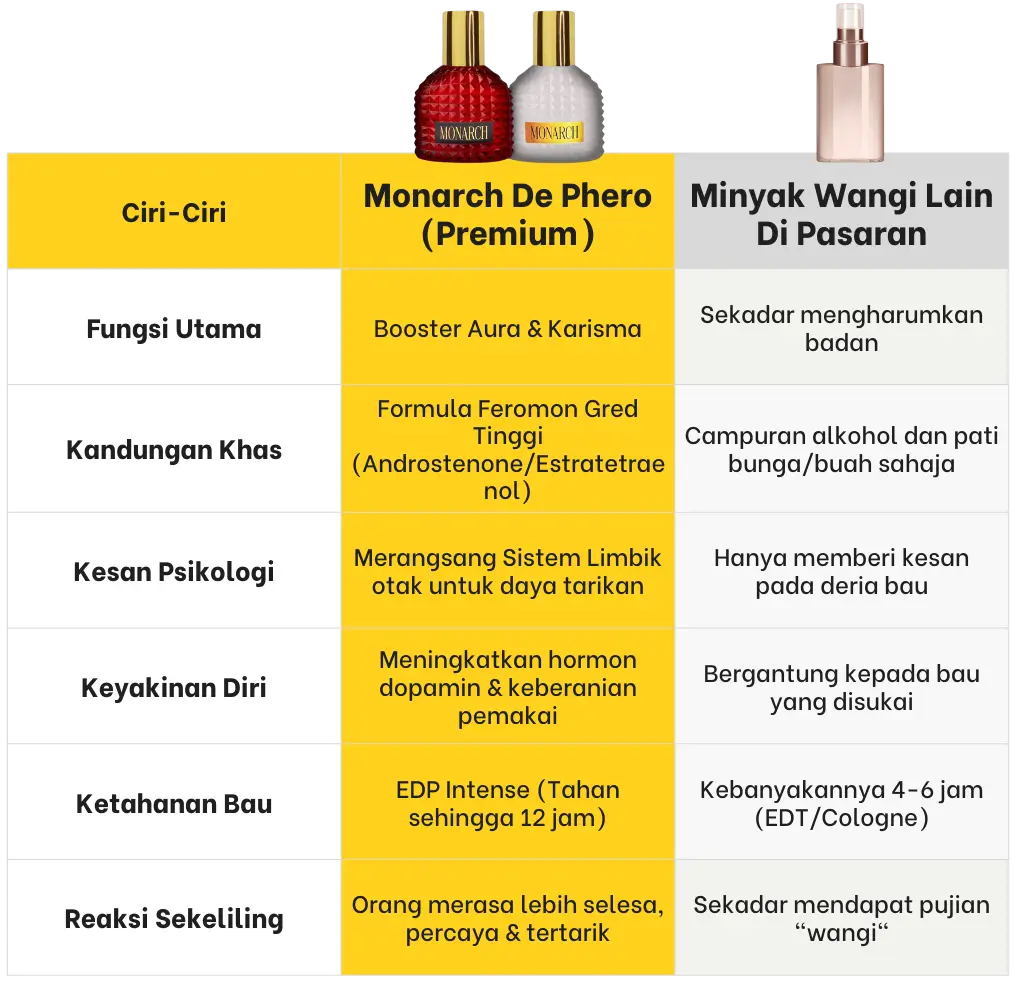 Ia bukan sekadar minyak wangi biasa. Ia adalah wangian gred premium yang diadun dengan formula Feromon pekat. Ia berfungsi menghantar isyarat kimia ke otak orang sekeliling untuk meningkatkan daya tarikan, kewibawaan, dan kepercayaan terhadap pemakai.