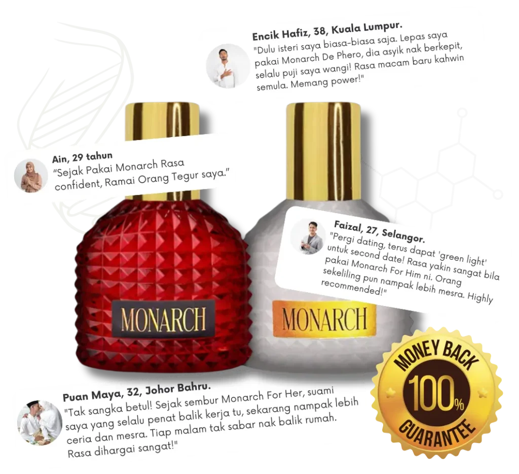 Penafian: Produk Monarch De Phero adalah bauan wangian berasaskan feromon untuk kegunaan luaran sahaja. Keberkesanan produk mungkin berbeza-beza mengikut individu (tindak balas kimia badan). Produk ini tidak bertujuan untuk merawat atau mendiagnosis sebarang masalah kesihatan.